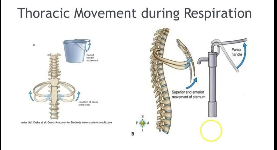 There are two main movements that the ribs perform with breathing; pump handle and bucket handle. Below is a description of both.